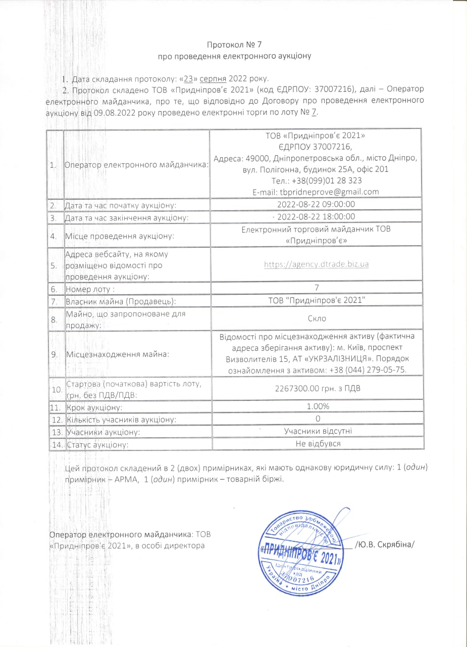 | Умови оплати | Переможець електронних торгів протягом п'яти банківських днів з дня наступного за днем підписання протоколу електронних торгів, а саме до дати, зазначеної у протоколі електронних торгів зобов’язаний: 1) перерахувати кошти за придбаний актив на рахунок АРМА, вказаний у протоколі електронних торгів; 2) звернутися до АРМА, надати документальне підтвердження перерахування коштів за придбаний актив (лот) на рахунок АРМА, вказаний у протоколі електронних торгів. |