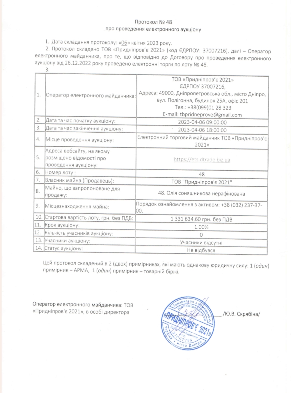 Актив реалізується без ПДВ. Дата публікації активу: 30.03.2023р. Контактні дані Організатора: ТОВ "Придніпров'є 2021", 49000, Дніпропетровська обл., місто Дніпро, вул. Полігонна, будинок 25А, офіс 201, +38 (099) 01 28 323, tbpridneprove@gmail.com